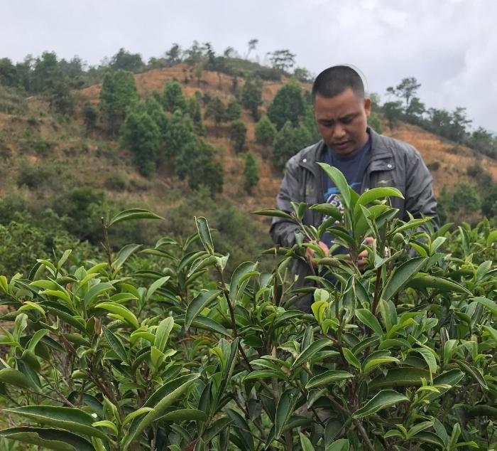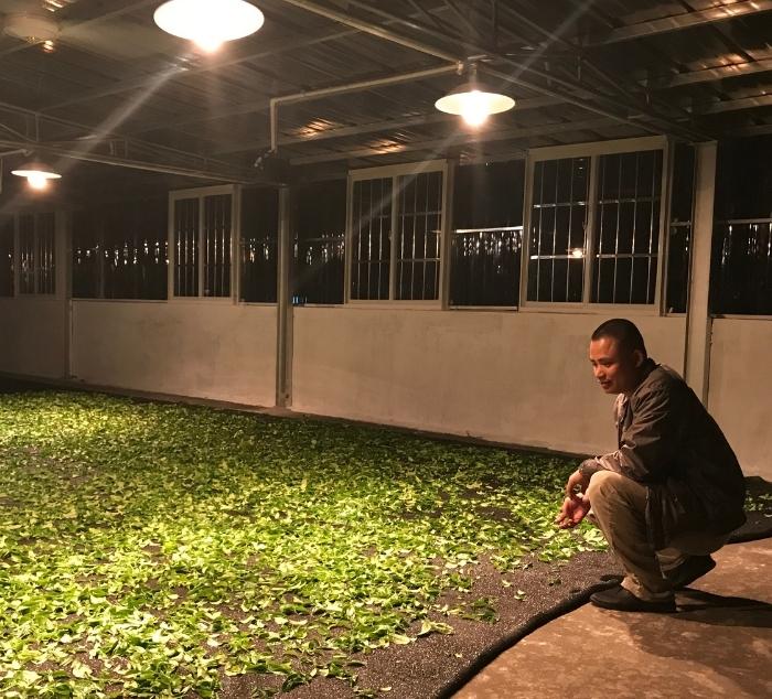 tea master brian in a tea field with ya shi xiang cultivar tea plants